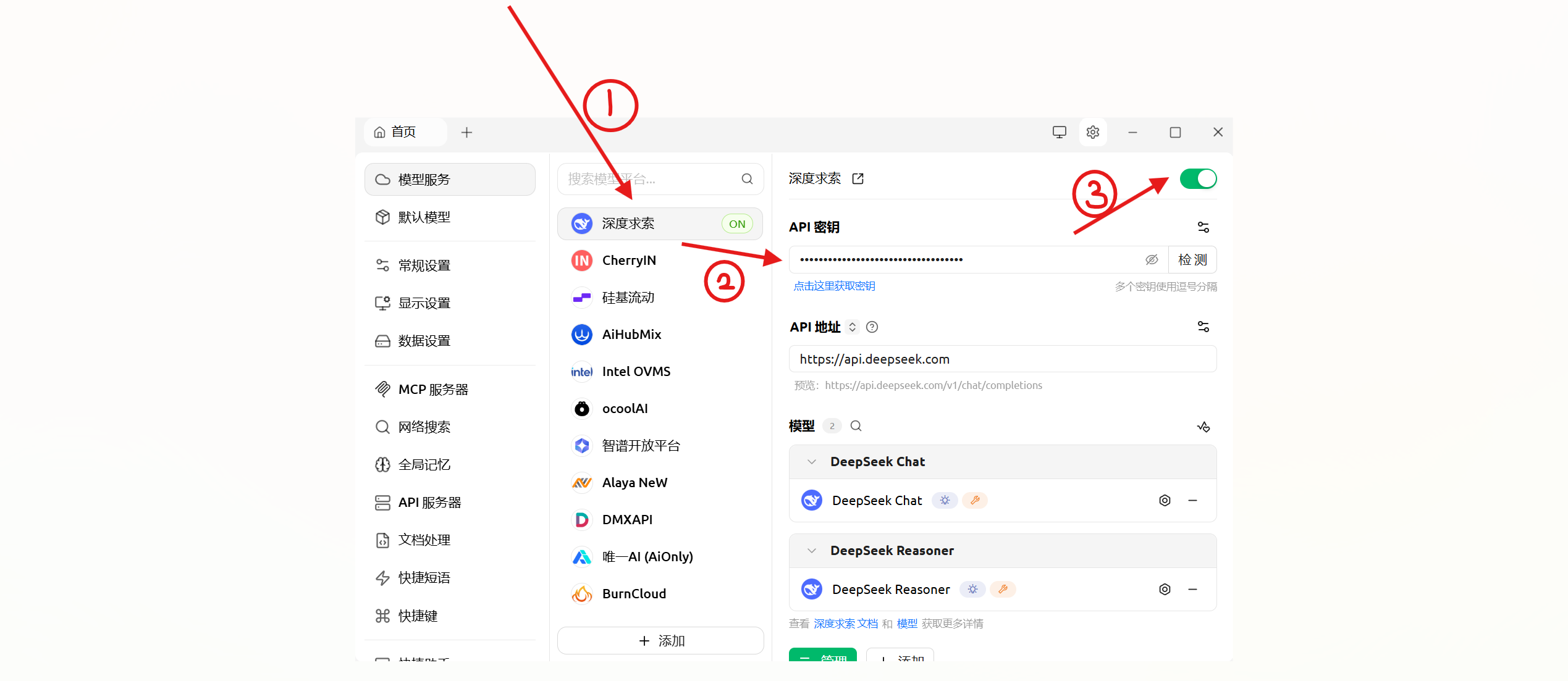 如果想要调用其他大模型,只需要去官网申请 api,然后在Cherry Studio 的设置中选择对应的选项,填入 api key,然后将该模型设置为开启即可,总体步骤和 Deepseek 的调用大同小异。